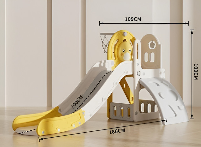 Ігровий комплекс оснащений гіркою, скалодромом та баскетбольним кільцем з мʼячиком, що забезпечує безліч можливостей для активного дозвілля та розвитку дитини.